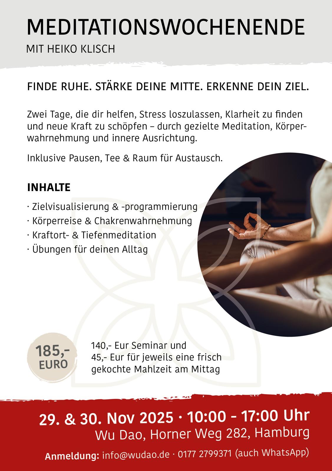 Erlebe ein tiefgehendes Meditationswochenende, welches ganz im Zeichen von Körperwahrnehmung, Entspannung und innerer Klarheit steht. In einer ruhigen und unterstützenden Atmosphäre erwarten dich geführte Meditationen, gezielte Körperübungen sowie Techniken zur Zielprogrammierung und Visualisierung. Du lernst, deinen Geist zu fokussieren, Stress abzubauen und neue Energie zu schöpfen – für mehr Balance, Gelassenheit und Ausrichtung im Alltag.